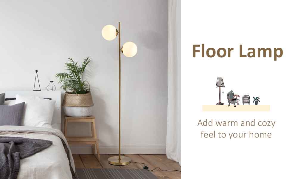 The HOMCOM 2 Lights Tree Floor Lamp features a durable gold-tone metal frame with two elegant glass globe lampshades that provide bright, ambient lighting. Designed for indoor use, it includes a stable rounded base and a convenient foot pedal switch on a 1.8m cord for hands-free operation. Compatible with universal E27 bulbs (not included), this 165cm tall lamp is a perfect blend of modern design and functional lighting for living rooms and bedrooms.