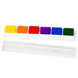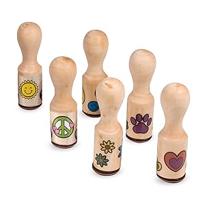 Melissa & Doug Deluxe Happy Handle Stamp Set features 10 unique rubber stamps with extra-long wooden handles, a 6-color washable ink pad, 5 colored pencils, and a sturdy wooden storage tray. Designed for kids aged 3 and up, it encourages creativity and motor skill development without the mess.