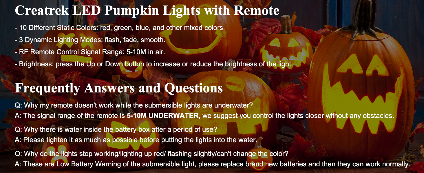 Creatrek Pumpkin Lights are battery-operated, submersible LED lights featuring 10 static and 3 dynamic color modes, controlled remotely via RF remotes with a 5-10 meter range. Designed for indoor and outdoor use, these 2.7-inch waterproof lights run 5-8 hours on 3 AAA batteries each, perfect for pools, ponds, parties, and seasonal decor.