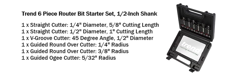 The Trend SET/SS11X1/2TC is a 6-piece starter router cutter set featuring 1/2-inch shank TCT bits designed for precision cutting across multiple wood types. Packaged in a durable plastic carry case with handle, it offers professional-grade versatility and portability at an excellent value.