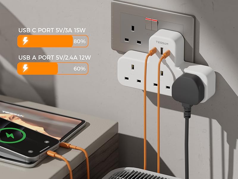 The TESSAN USB C Charger Plug UK is a compact, multi-functional 3-way extension socket featuring 3 AC outlets and 3 USB ports (including USB C) with a max output of 15W. Designed for high power capacity (up to 3250W) and safety with a built-in 13A fuse, it offers a neat, cable-free charging solution ideal for home, office, or school environments.