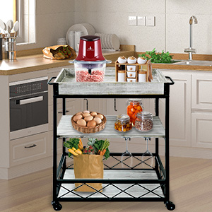 Ohsuaniy Bar Cart, Portable Serving Bar Carts with Movable Tray, Mobile 3 Tire Rolling Wooden Trolley with Wheels and Glass Holder, Rustic Vintage Cart with Black Metal Frame and Wood Shelves, Grey