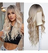 This synthetic long layered blonde wig features a natural hand-tied hairline and 130% density for a realistic, voluminous look. Heat resistant up to 160°C, it allows styling with hot tools. Adjustable cap size (21.5-23.5 inches) ensures a comfortable fit with ventilation. Perfect for daily wear or parties, it offers an ombre blonde shade with dark roots and bangs, suitable for all face shapes. Comes with a 30-day return policy for risk-free style experimentation.