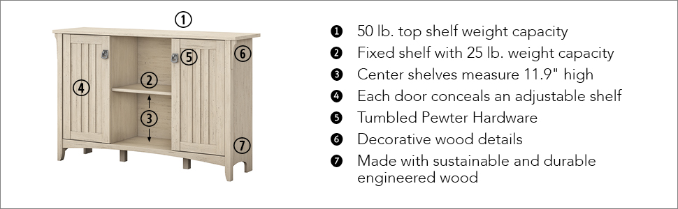 The Bush Furniture Salinas Accent Storage Cabinet combines modern farmhouse style with practical storage solutions. Featuring a durable engineered wood construction, this cabinet offers flexible organization with adjustable shelves and a charming design that fits seamlessly into any home decor. Ideal for various spaces, it ensures safety and stability while enhancing your living environment.
