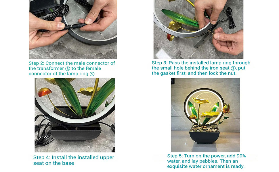 The Golden A Lotus Desk Fountain is a compact indoor tabletop waterfall featuring a three-layer cascading design with realistic lotus leaves and natural river stones. Measuring 6.69 x 6.69 x 10.43 inches, it delivers soothing water sounds and a tranquil visual experience, perfect for meditation, stress relief, and stylish office or home decor.