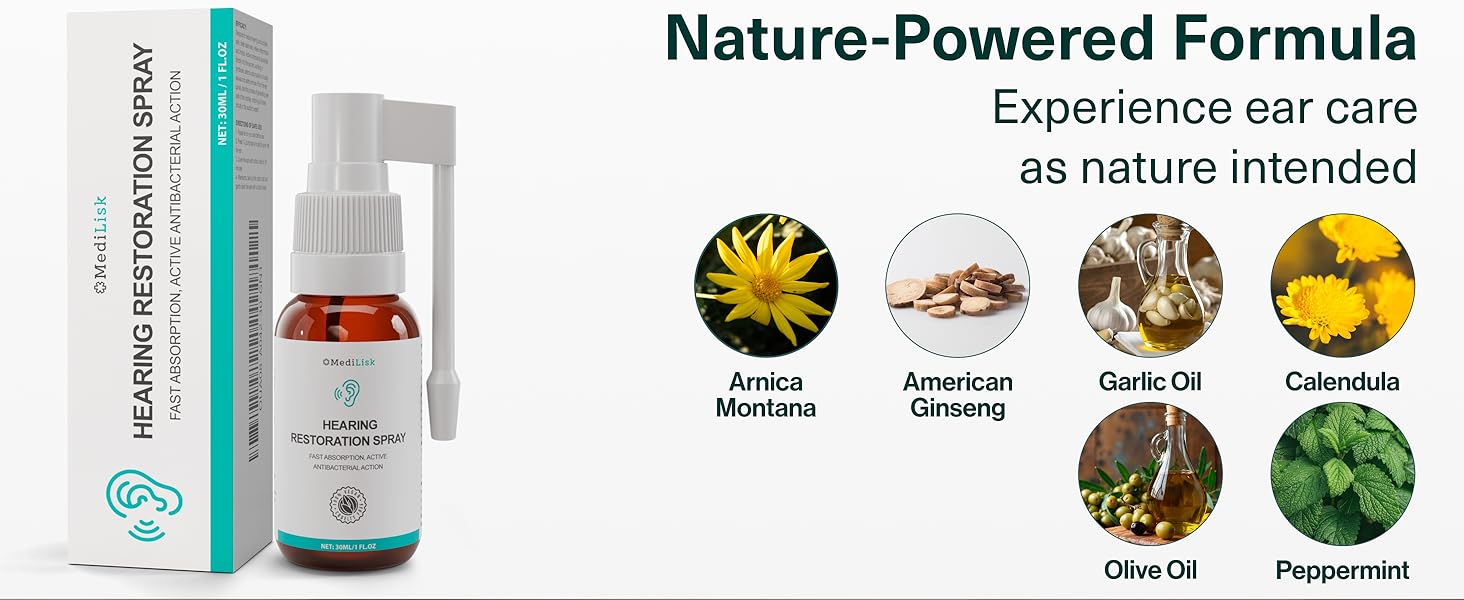 The Hearing Restoration Spray is a 1 Fl.Oz ear care solution designed to promote ear hygiene and comfort. Formulated with natural ingredients, it is gentle enough for sensitive ears and features an easy spray application for convenient use. Ideal for maintaining ear cleanliness without harsh chemicals.